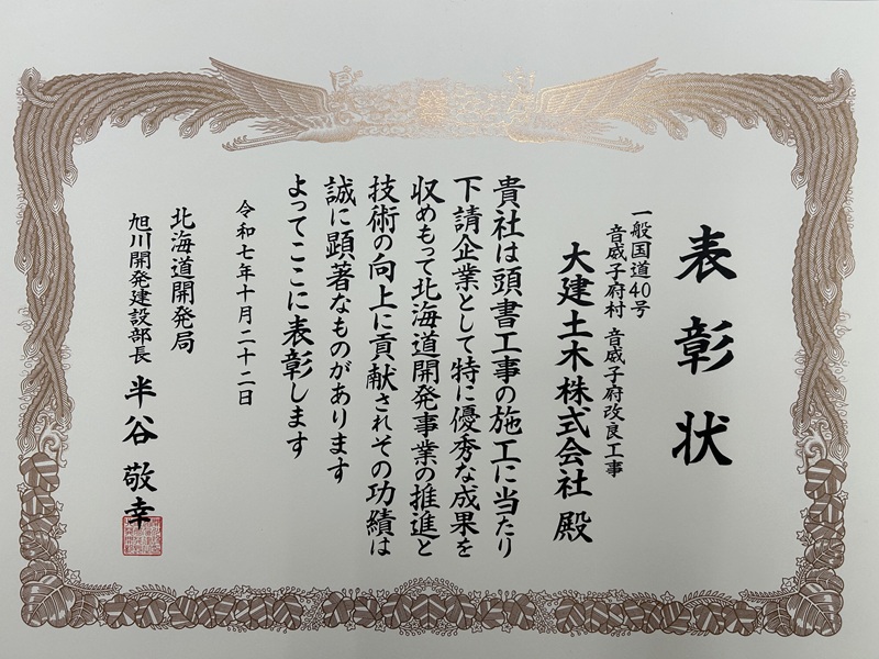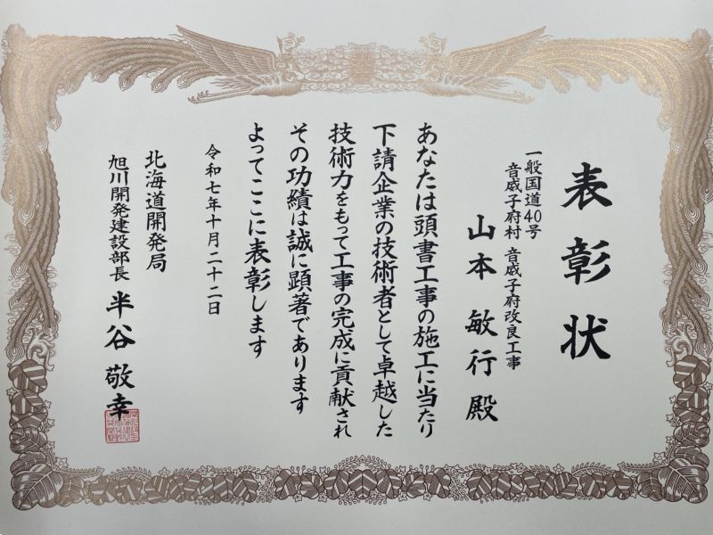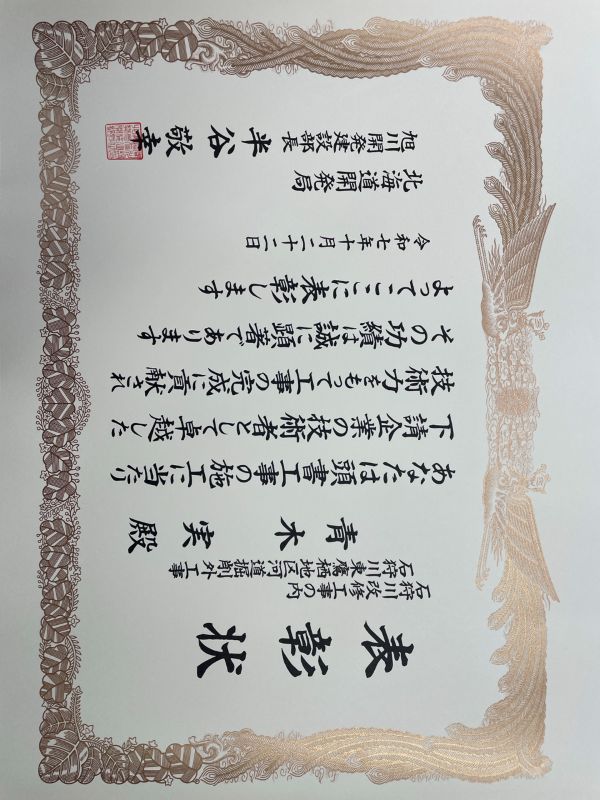 上記2工事で、下請企業・下請企業技術者として表彰をいただきました。